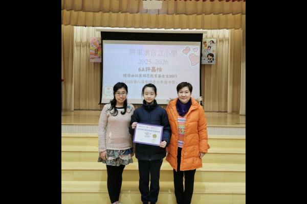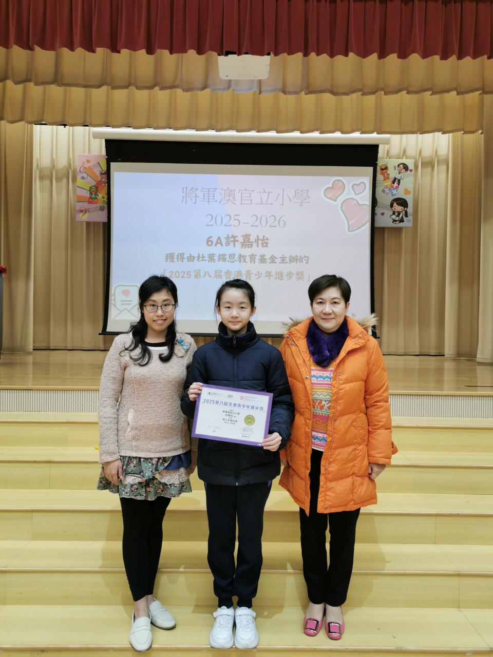 2026-03-09 經由班主任歐老師及司徒老師推薦,5A姚的政及6A楊少妍獲得由星島新聞集團主辦的「我要讚佢」最值得表揚學生獎勵計劃。此外,6A許嘉怡亦獲得由杜葉錫恩教育基金主辦的「2025第八屆香港青少年進步獎」。恭喜以上三位獲獎同學,他們除了在校內獲得校長嘉許,也在1月31日分別出席了以上機構舉辦的頒獎禮及領獎活動。 校外比賽