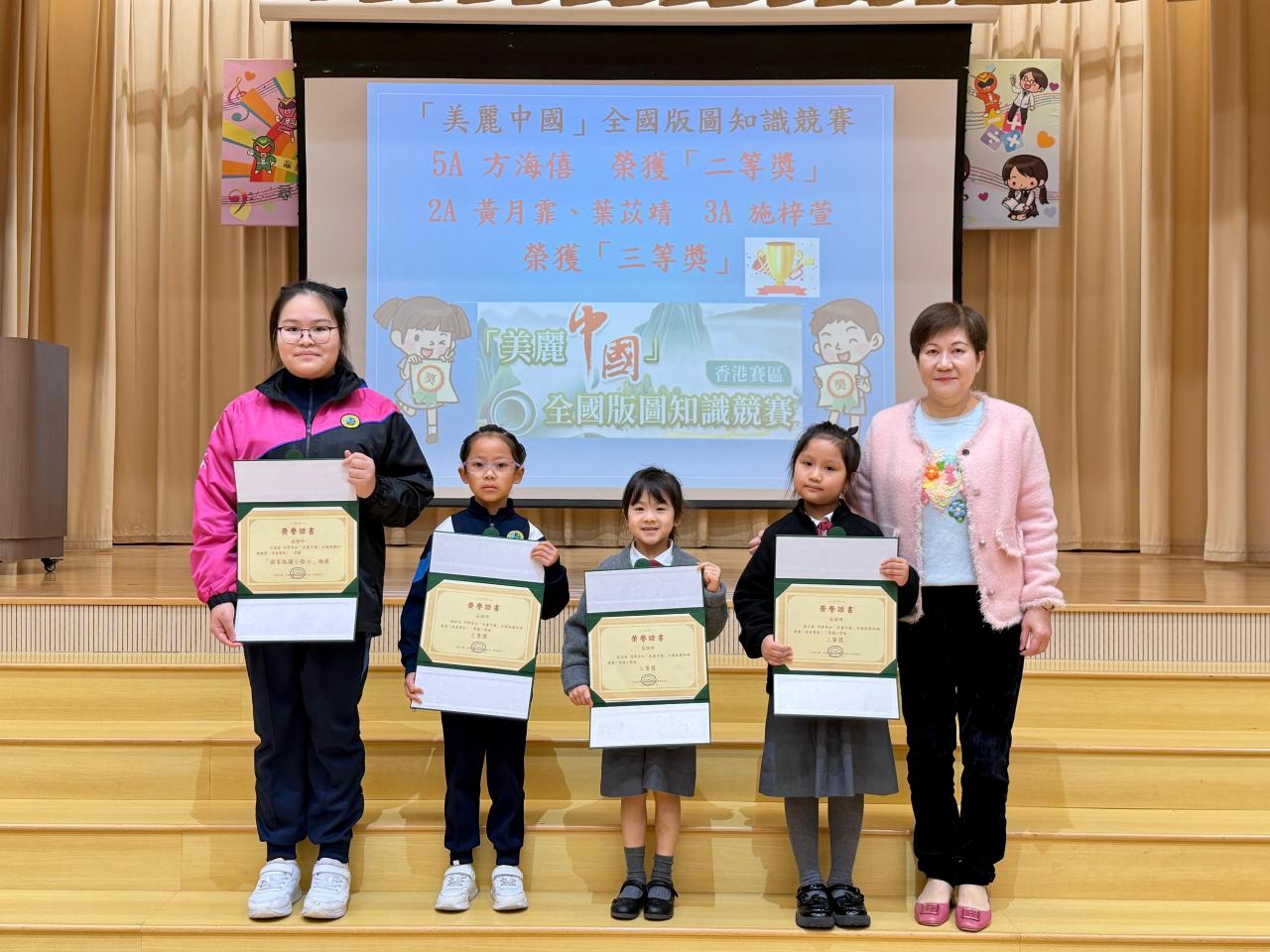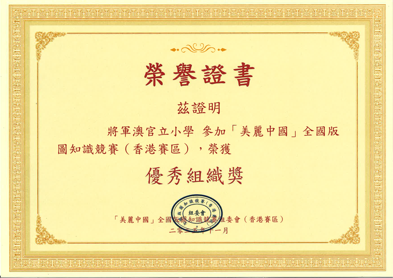 2026-02-20 恭喜本校及以下七位優秀同學於「美麗中國」全國版圖知識競賽(香港賽區)網上比賽中(由國家自然資源部宣傳教育中心主辦)榮獲各獎項:本校獲得「小學組優秀組織獎」二等獎:5A方海僖三等獎:2A黃月霏 2A葉苡靖 3A施梓萱 優異獎:4A洪浚鋮 5A江梓菱 6A吳澤銘國家版圖小衛士(單次答題取得滿分的同學): 2A黃月霏 3A施梓萱 5A方海僖 校外比賽