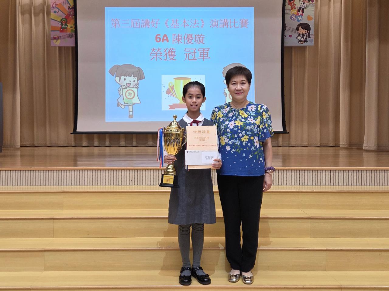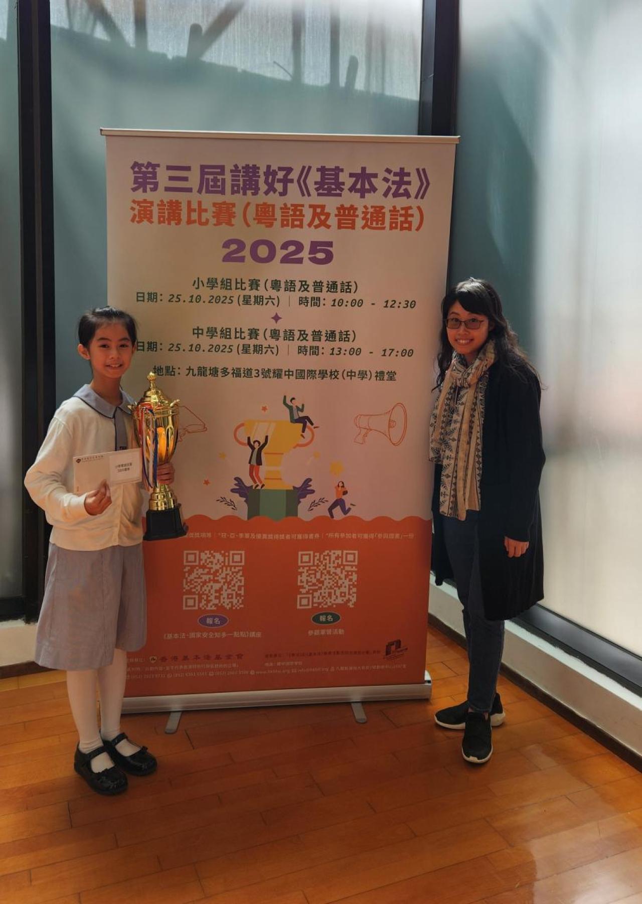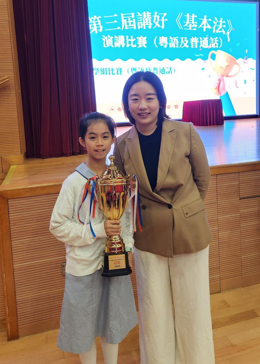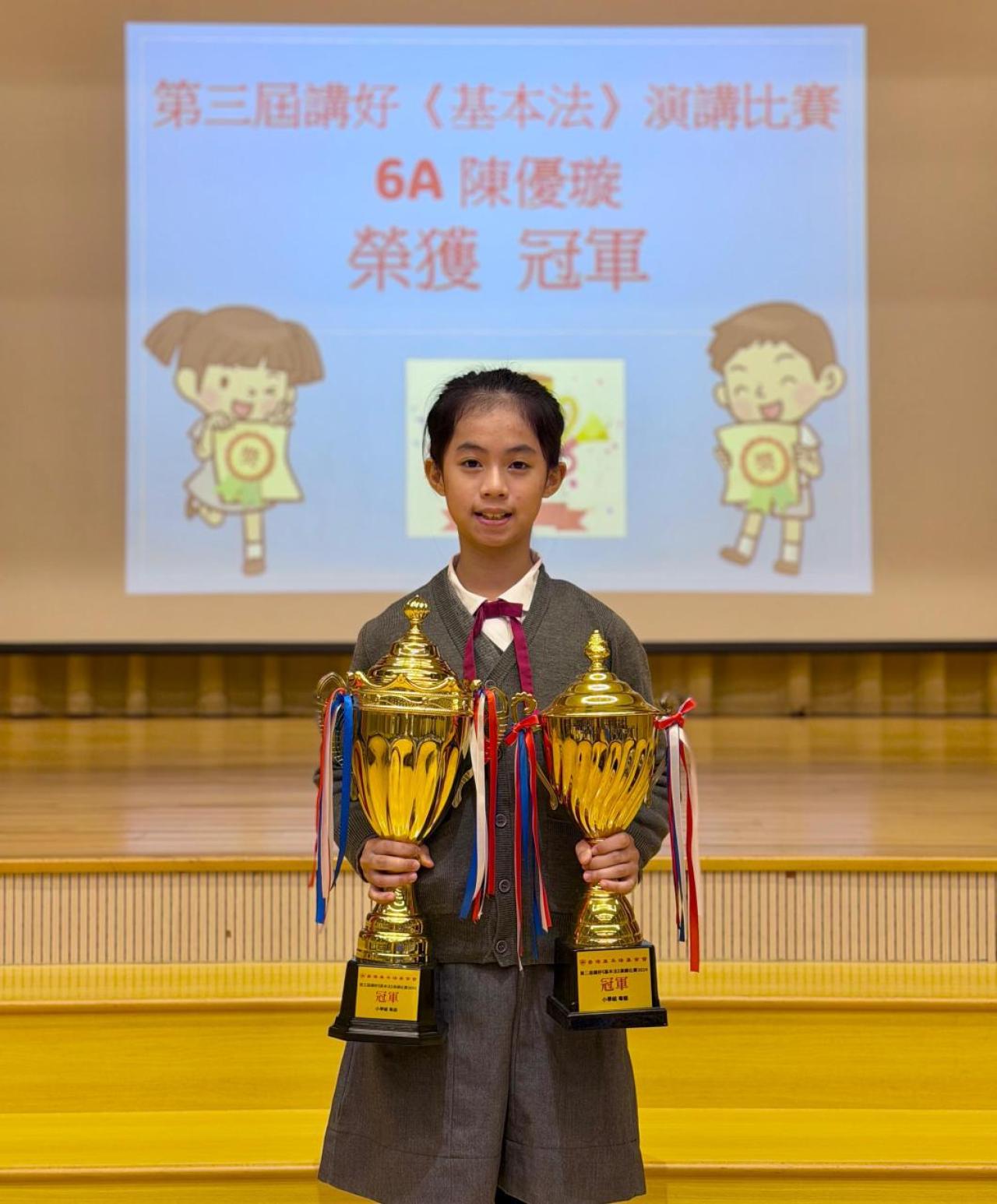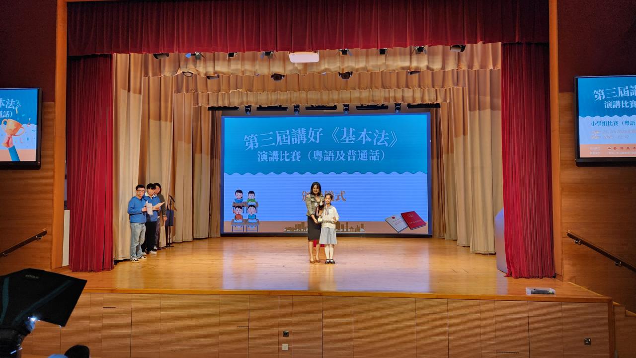 2025-11-14 第三屆講好《基本法》演講比賽恭賀6A陳優璇同學繼去年參加了由香港基本法基金會主辦的「第二屆講好《基本法》演講比賽」中獲得冠軍之佳績,本年度再次於這場匯聚了來自全港多所學校的優秀參賽者,競爭非常激烈的「第三屆講好《基本法》演講比賽」中,憑藉優秀的演説技巧、真摯的情感表達,最重要是對《憲法》及《基本法》的深入理解,在眾多參賽者中脫穎而出,再次勇奪冠軍殊榮!