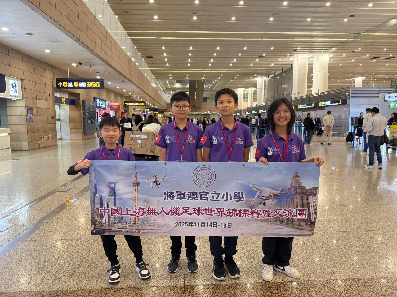 2025-11-14 本校無人機足球隊今日精神奕奕,從八月從地區選拔中脫穎而出,到現在終於踏上前往上海的旅程,參加 無人機足球世界錦標賽,並以「中國香港」身份代表出戰!同學們在過去數月努力不懈的訓練,從操作到戰術部署皆精益求精,充分展現團隊精神與堅持。感謝家長與學校一直以來的支持,成為同學的強大後盾。祝願隊伍在賽場上全力發揮、享受比賽,展現中國香港隊的風采!將官無人機足球隊,加油!