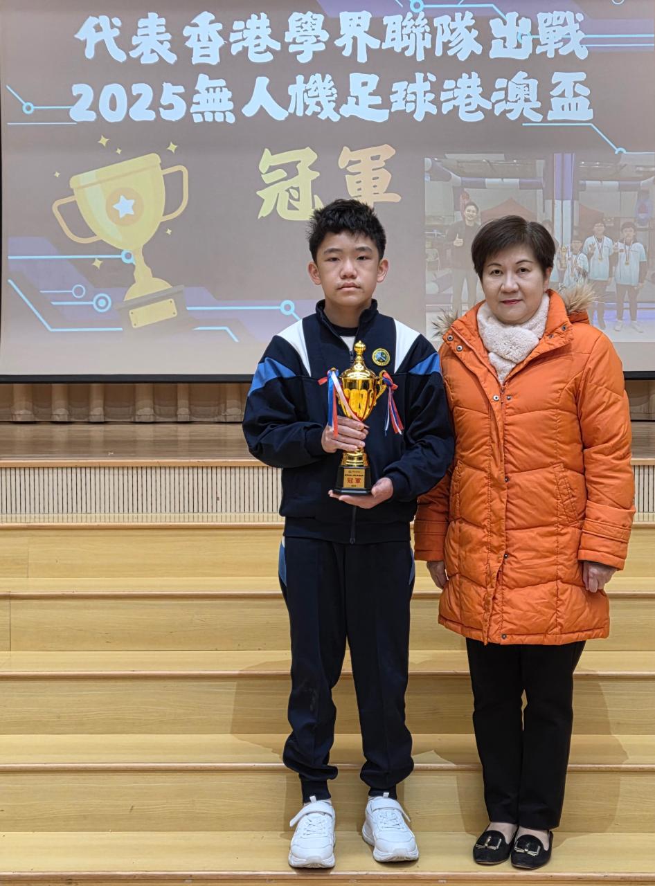 2026-02-25 喜訊傳來!本校 6A 陳菁朗 同學獲選為 香港學界聯隊成員,並聯同兩位已畢業校友,成功擊敗 澳門代表隊及中學隊伍,最終於「2025 無人機足球港澳盃」中勇奪 冠軍!🎉 🏅 是次比賽不僅展現同學卓越的技術與臨場應變能力,更體現跨校合作與薪火相傳的精神,實在可喜可賀! 👏 恭喜陳菁朗同學,亦感謝關校長及老師們一直以來的支持與培育。