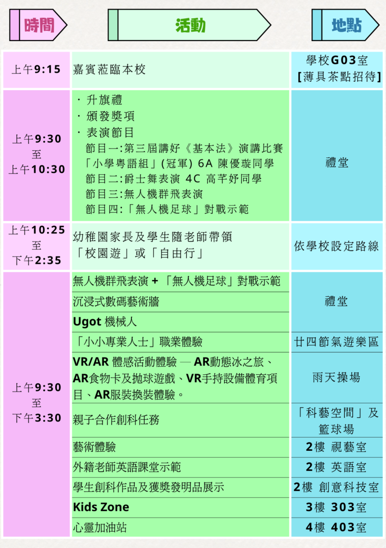 | 上午 9:30 至下午 3:30 | 多項體驗活動: ・無人機群飛表演 +「無人機足球」對戰示範 ・沉浸式數碼藝術牆 ・Ugot 機械人 ・「小小專業人士」職業體驗 ・VR/AR 體感活動體驗(AR 動態冰之旅、AR 食物卡及拋球遊戲、VR 手持設備體育項目、AR 服裝換裝體驗) ・親子合作創科任務 ・藝術體驗 ・外籍老師英語課堂示範 ・學生創科作品及獲獎發明品展示 ・Kids Zone ・心靈加油站 | 對應地點: ・禮堂(無人機 / 藝術牆 / 機械人) ・廿四節氣遊樂區(「小小專業人士」) ・雨天操場(VR/AR 體驗) ・「科藝空間」及籃球場(親子創科任務) ・2 樓視藝室(藝術體驗) ・2 樓英語室(英語課堂) ・2 樓創意科技室(創科作品展示) ・3 樓 303 室(Kids Zone) ・4 樓 403 室(心靈加油站) |